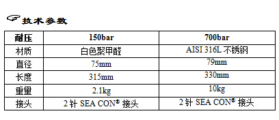 OCEAN SEVEN可充电水下电池组由12节1.2V的镍氢电池串联组成,输出电源为14.4V直流,4.5Ah。外壳为聚甲醛或AISI 316L不锈钢。电池组包含一个塑料法兰,国际通用充电器和一根水下电缆。电池组可以给OCEAN SEVEN 3xx系列CTD供电。